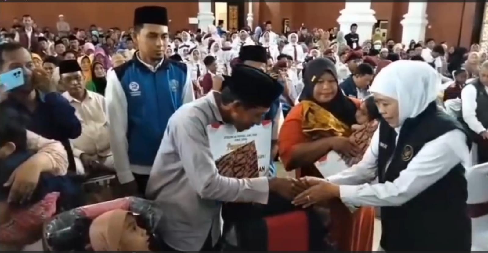 Gubernur Jawa Timur Khofifah Indar Parawansa menyerahkan bantuan sosial dan tali asih senilai Rp13,76 miliar kepada masyarakat Kabupaten Pamekasan, Minggu, 8 Maret 2026.