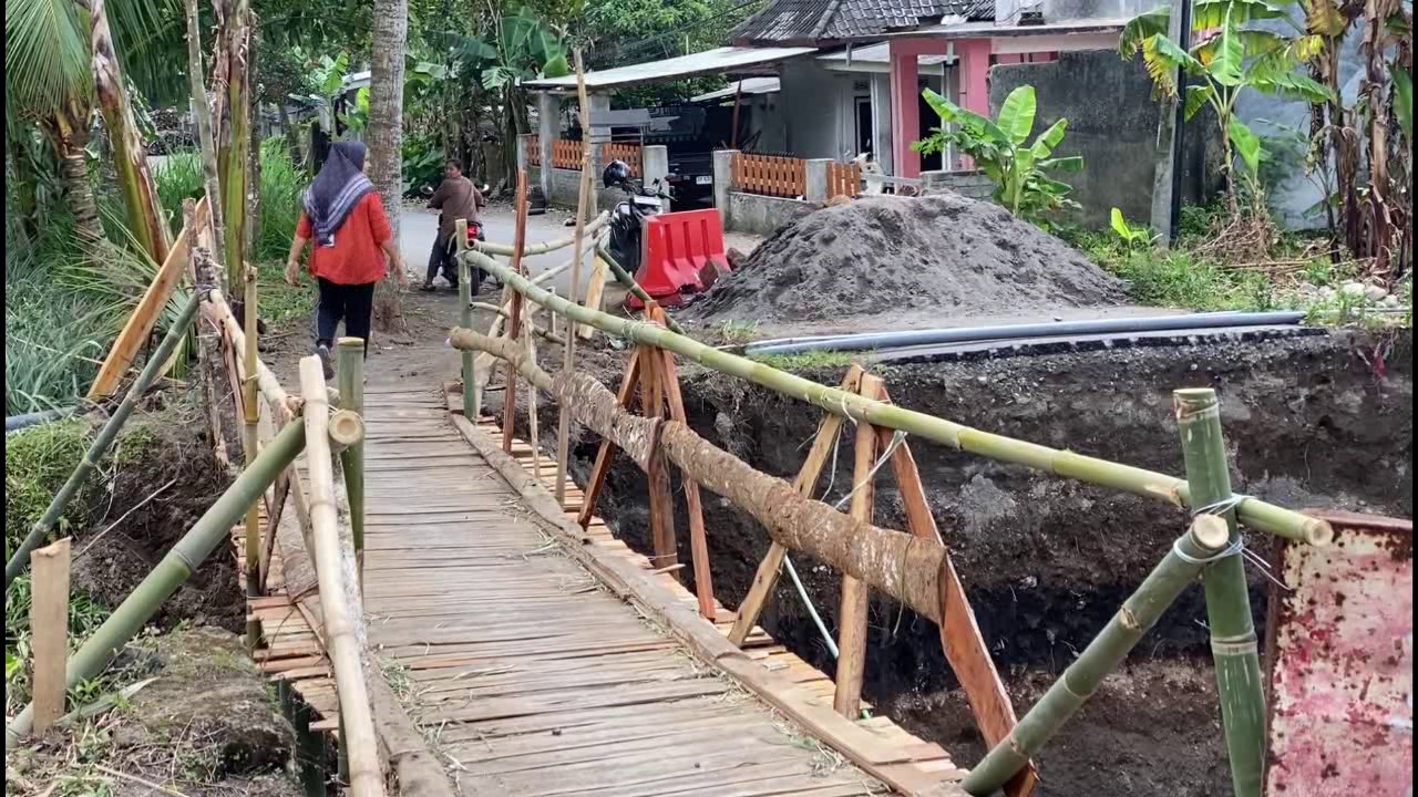 Sebagai langkah antisipasi sementara, warga secara swadaya telah membangun jembatan darurat yang terbuat dari bambu dan papan. Jembatan tersebut difungsikan sebagai akses bagi pejalan kaki dan kendaraan roda dua. Meskipun membantu mobilitas, struktur jembatan darurat ini dinilai masih rawan dan berisiko membahayakan keselamatan pengguna jalan.