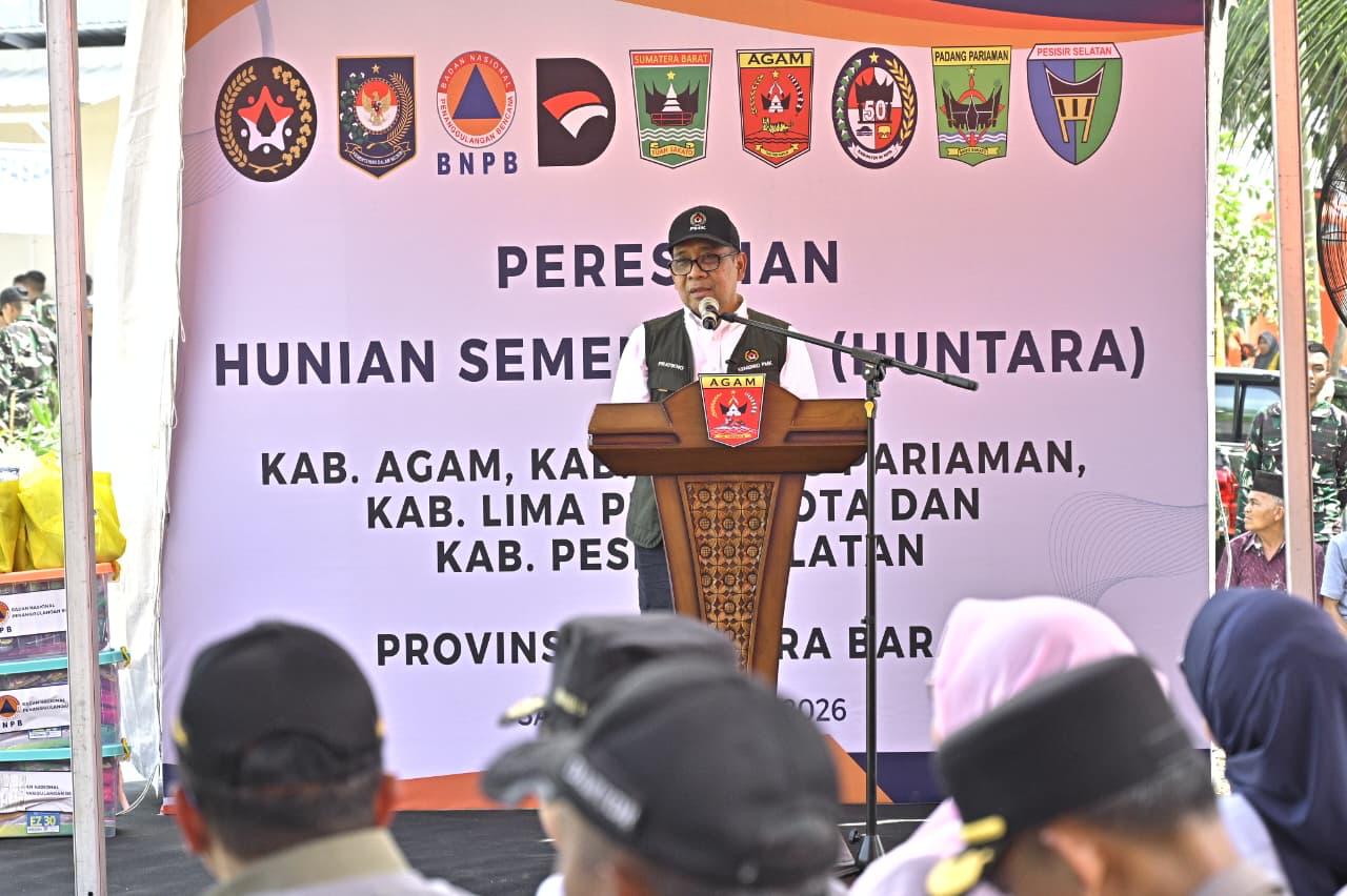 Pemerintah pusat bersama Pemerintah Provinsi Sumatera Barat meresmikan Hunian Sementara (Huntara) bagi warga terdampak bencana di Kecamatan Palembayan, Kabupaten Agam, Sabtu, 24 Januari 2026.
