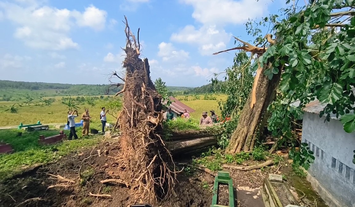 Tidak hanya merusak permukiman, angin kencang juga merobohkan puluhan pohon berukuran besar. Material pohon yang menutup badan jalan membuat akses utama desa sempat lumpuh total. Bahkan, satu pohon jati berdiameter besar dilaporkan roboh dan menghantam area pemakaman desa.