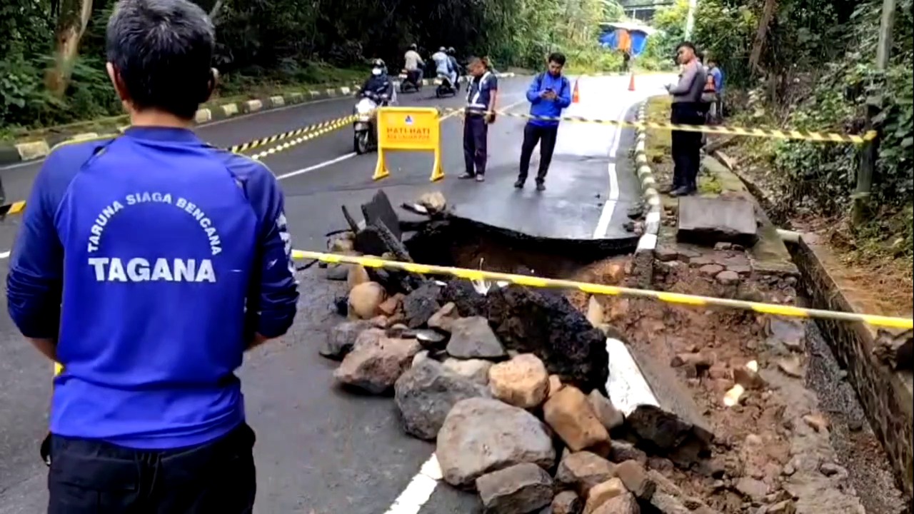 Dampaknya, badan jalan mengalami ambles hingga membentuk lubang besar, sementara semburan air sempat membanjiri area sekitar lokasi kejadian.