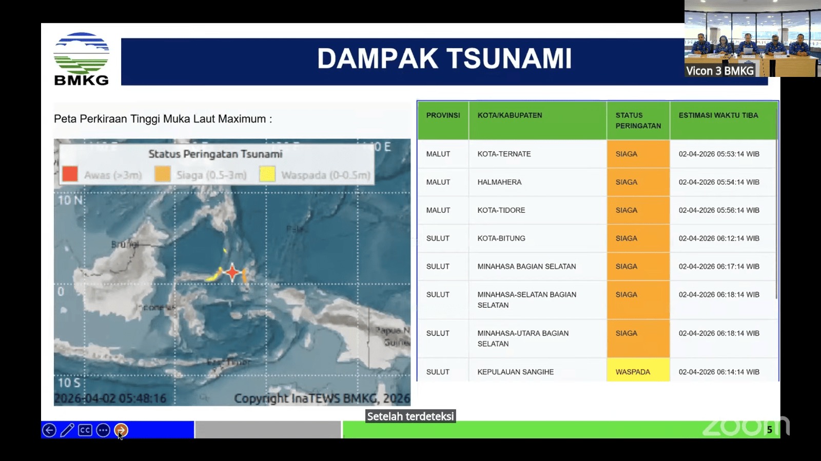 Badan Meteorologi, Klimatologi, dan Geofisika (BMKG) mengakhiri peringatan dini tsunami akibat gempa bumi magnitudo 7,6 yang mengguncang wilayah Pantai Barat Daya Pulau Batang Dua, Ternate, Maluku Utara, Kamis, 2 April 2026 pukul 05.48 WIB. Meski peringatan dini telah berakhir, BMKG mengimbau masyarakat tetap waspada terhadap gempa susulan.