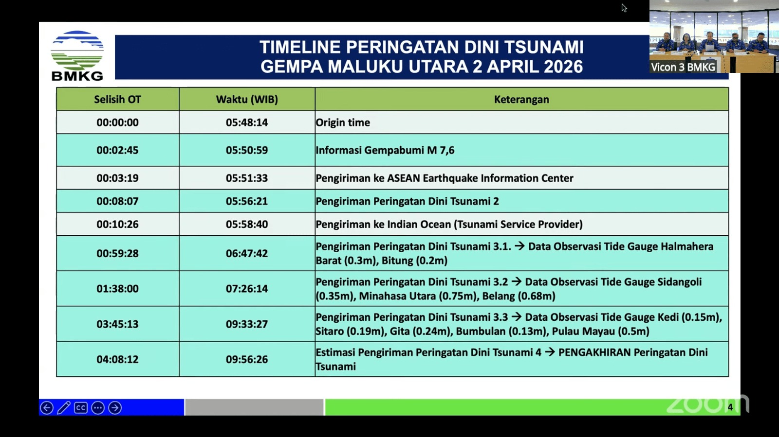 “Peringatan dini tsunami dikeluarkan secara bertahap, mulai dari informasi awal gempa, pembaruan parameter, hingga observasi muka air laut sebelum akhirnya peringatan dini diakhiri,”ungkap Rahmat.