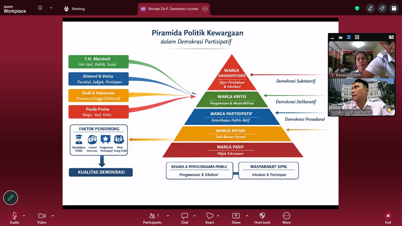 Badan Pengawas Pemilu Kabupaten Flores Timur (Bawaslu Flotim) menggelar kegiatan peningkatan kapasitas bagi jajaran pengawas pemilu. Kegiatan ini menghadirkan Ketua Bawaslu Provinsi Nusa Tenggara Timur (NTT), Nonato Da Purificacao Sarmento, sebagai narasumber, dan berlangsung di Media Center Bawaslu Flotim, Rabu, 22 April 2026.