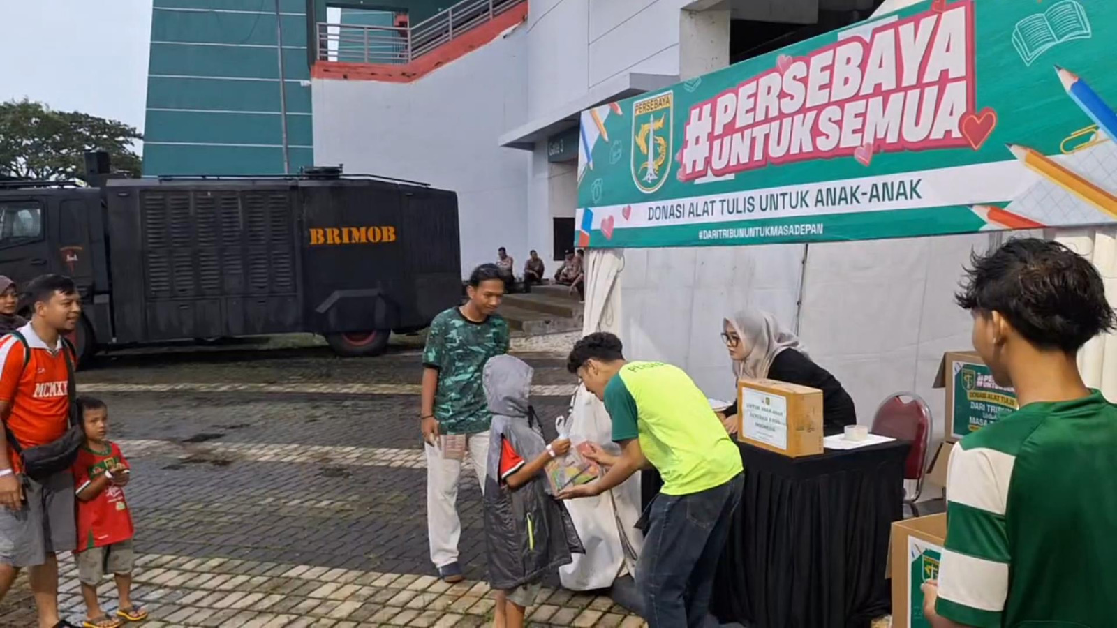 Bonek tak hanya mendukung tim kesayangan di lapangan, tetapi juga menunjukkan kepedulian terhadap sesama dengan membawa barang-barang yang akan sangat bermanfaat bagi anak-anak yang membutuhkan.