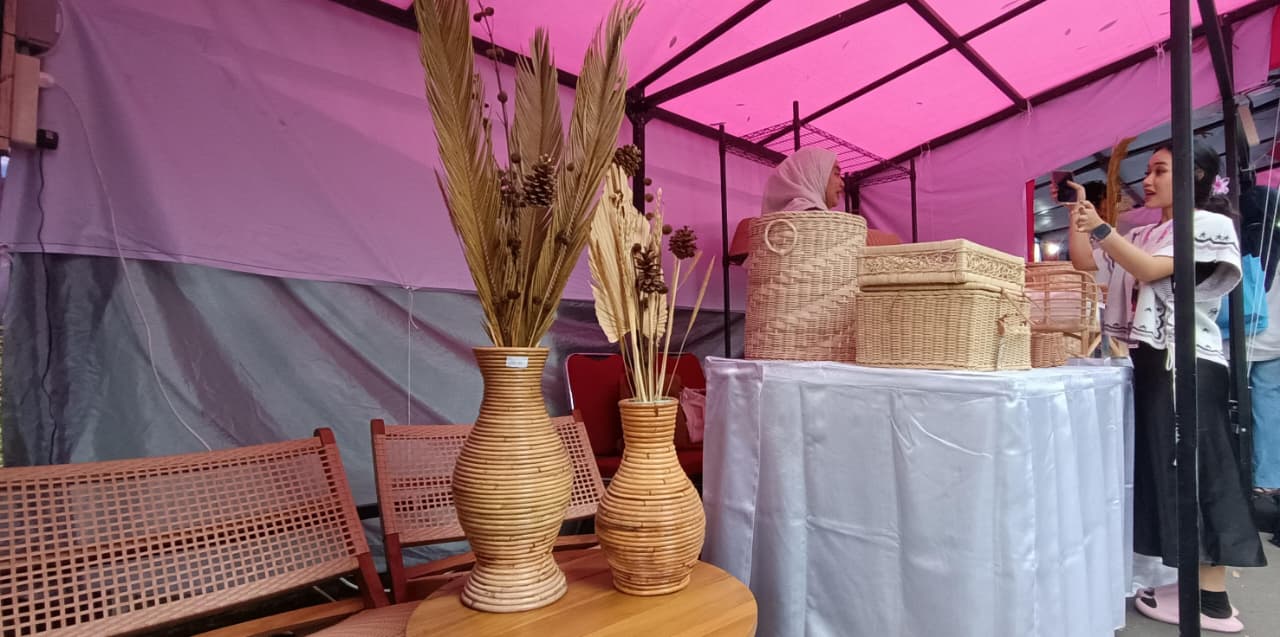 Ditemui di helatan Pasar Seni ITB 2025, Rina menata berbagai furnitur rotan berbentuk kursi, pot bunga, keranjang, hingga wadah hampers. Di bawah label Wonderful Rotan, ia bersama Agus, suaminya, mendirikan lini UMKM kriya tersebut sejak tahun 2022.